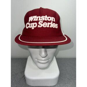 Design: Red front panels and brim with contrasting white rope trim and thick embroidered "Winston Cup Series" script across the front.