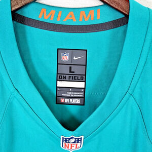 The Miami Dolphins Nike Football Jersey features the official NFL player Tyreek Hill #10, making it a must-have for any Dolphins fan. This officially licensed jersey in men's size Large is designed in the team's signature aqua/teal color, perfect for showing support on game day. Crafted by Nike, this jersey is made for the ultimate football enthusiast and represents the team with pride. Perfect for wearing during games or as a collectible item for fans of the Miami Dolphins.