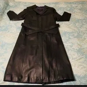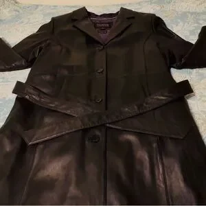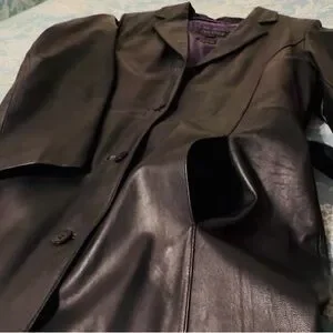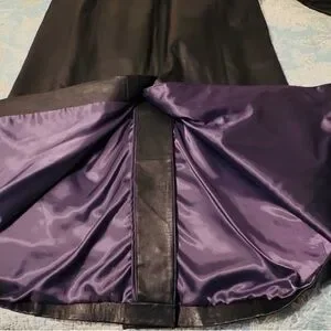 Wilson’s Leather Pelle Studio blk leather duster coat, lrg, purple liner, nice!