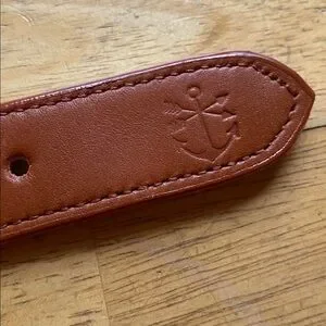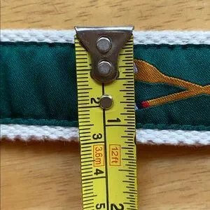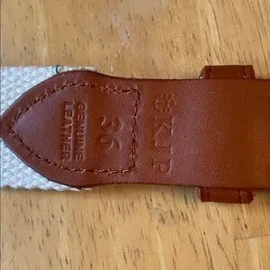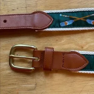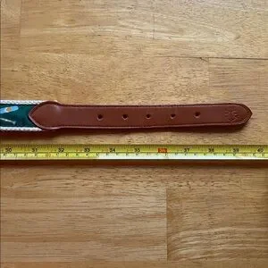 Stylish Kiel James Patrick belt. Features green fabric with oar pattern. Brown leather accents. Perfect for casual wear. This belt fits more like a size 32 waist though it is marked on belt as 36.