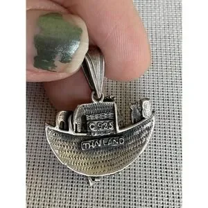 The product is a vintage sterling silver pendant from Thailand, featuring a design of Noah's Ark. Being from estate jewelry, it holds a sense of history and classic charm. The pendant is a unique piece that showcases intricate craftsmanship and timeless style, adding a touch of elegance to any outfit.