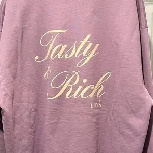 • Design: A lilac or purple-colored crewneck sweatshirt featuring a graphic print on the back that reads "Tasty & Rich" in a vintage-style script, with a small "Lily's" logo underneath.