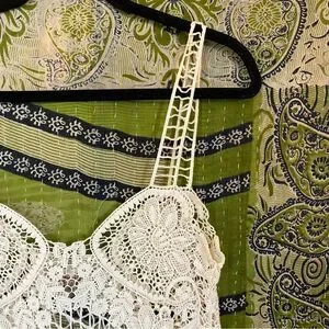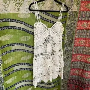 ▪️Style: Mini length, thin non-adjustable straps with ladder detailing, scalloped hemline, all-over crochet lace floral fabrication, sheer, stretchy, unlined (sold out online)