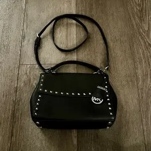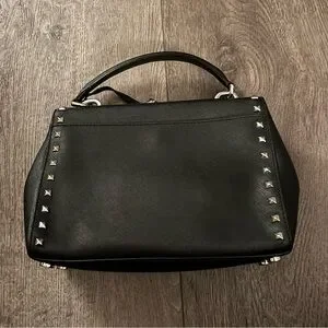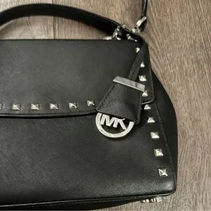 Item Description: Michael Kors Ava Stud Small Top Handle Leather Satchel, black Saffiano leather featuring silver-tone stud detailing along the front flap and edges, Flap with a magnetic snap closure, Features a top handle with approximately a 3" drop and an adjustable, removable shoulder strap, Includes a signature MK logo circle hanging charm encased in leather,