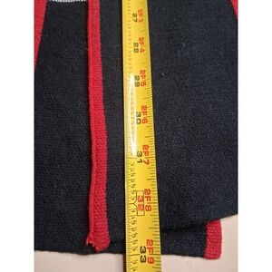 This cardigan features a bold plaid and striped pattern in navy blue, gray, and red, with eye-catching red trim that adds structure and polish. The open-front design allows for easy layering over blouses, dresses, or tops, making it a versatile statement piece.