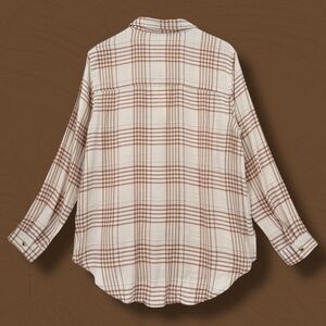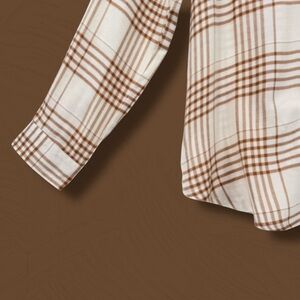 89B019980 Super soft flannel button-down in Ginger plaid. A cozy layering piece for the Cabincore or Gorpcore aesthetic in fall/winter. Materials: 100% Cotton Flannel. Trend Keywords: Cabincore, Flannel, Plaid.
