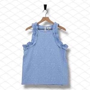 72625SPK Charming periwinkle blue top with a quilted texture and ruffle accents. A classic Southern Preppy piece that works well for brunch or casual Fridays. Materials: Cotton/Polyester Knit. Trend Keywords: Preppy, Ruffles, Pastel.