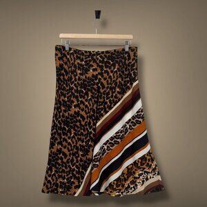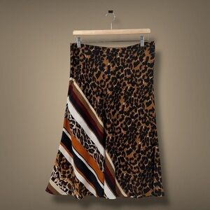 KS1S06 Designer midi skirt featuring a bold mix of cheetah print and stripes. Bias-cut for a fluid, flattering drape. A statement piece for Quiet Luxury styling. Materials: 100% Viscose. Trend Keywords: Quiet Luxury, Animal Print, Designer.