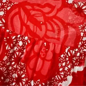 Design: Features a red floral and geometric patchwork print.