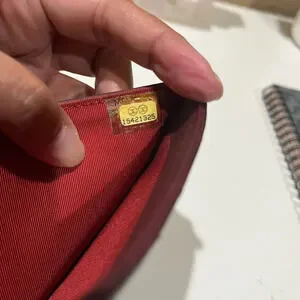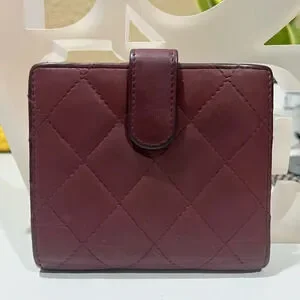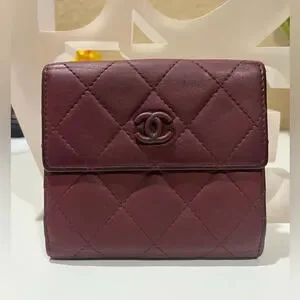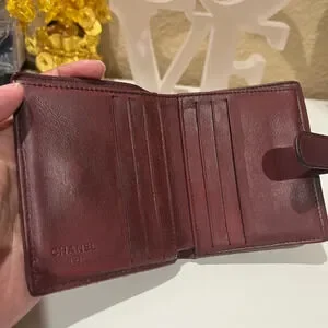 Authentic pre-loved. Matte maroon leather with CC pressure mat. Darkened edges. Weathered leather. Darkened CC. Dirt stains on the coin pocket. You can see the aged leather on the inside.