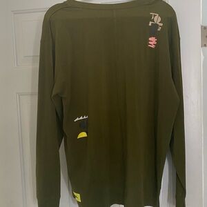 Stylish olive long sleeve shirt with abstract graphic design of Toronto. Features a mix of colors including pink, white, and black. size 12