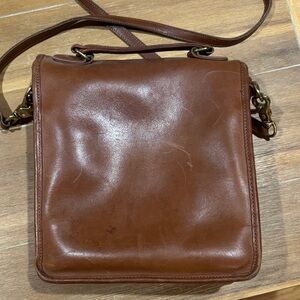 Elegant brown leather bag. Features a classic turn-lock closure. Adjustable strap for versatile wear.