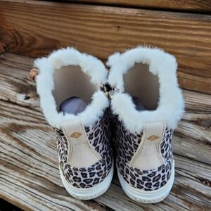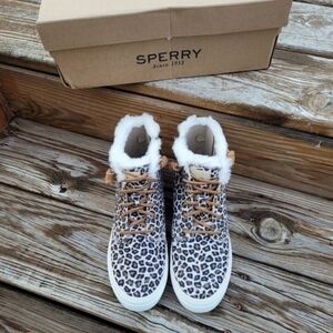 Sperry Crest High Top Faux Fur High Top Sneaker. Women's size 7. New with tags and box. The silhouette you know and love, now in a trend right high top. Round toe - Animal print canvas uppers and moccasin construction with signature barrel lace - Faux fur trim - Memory foam insole provides all-day comfort, and a flexible non-marking rubber outsole with the original Razor-Cut Wave-Siping. provides the ultimate no-slip traction - Grip sole