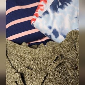 Peach Maxi dress, printed Kimono, cream blouse with peach/gold circle design, red open shoulder sweater, green sweater, blue/pink striped dress, and blue/red/white tie dye dress