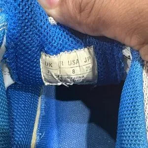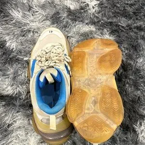 Stylish Balenciaga sneakers. Features blue and beige tones. Chunky sole design. Perfect for casual wear.