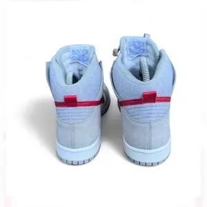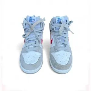 High-top sneakers with a bold red swoosh. Features a sleek gray and white design.