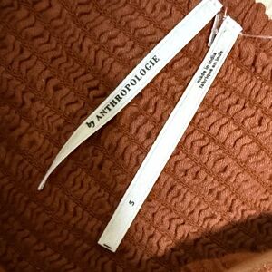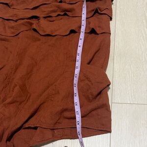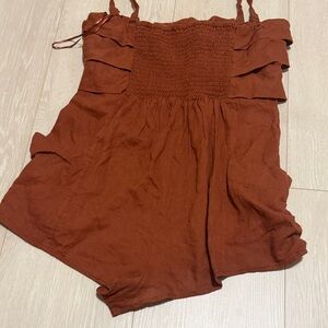 This Anthropologie terracotta romper features a chic tiered bodice and practical side pockets, ideal for relaxed outings.