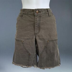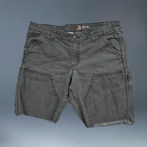 carhartt carpenter shorts canvas utility pockets, hammer loop, raw frayed hem, worn in fade, slim straight fit