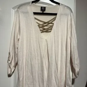 Chic cream blouse with gold crisscross design. Perfect for versatile styling.