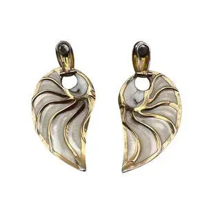 Vintage reversible earrings with omega backs, showcasing mother of pearl framed in gold-tone accents. Lightweight yet striking design.