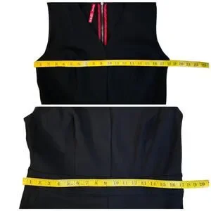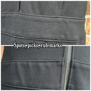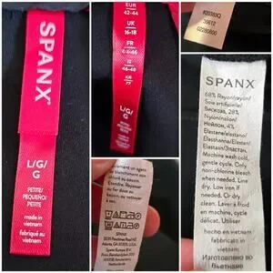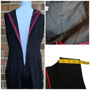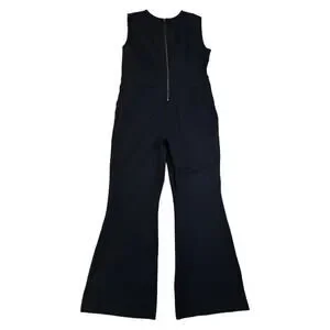 Black stretch ponte knit fabric. Sleeveless, rear zip, tummy control panel inside, v-neck, bootcut legs, faux pockets. Issues noted in photos. Very good preowned condition, overall. Size Large Petite LP by Spanx. Style: The Perfect Sleeveless Jumpsuit