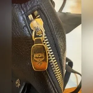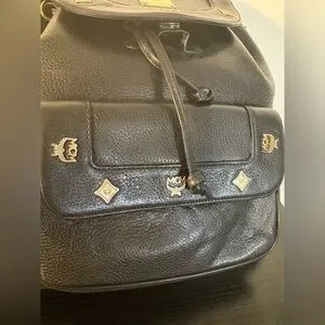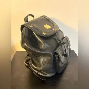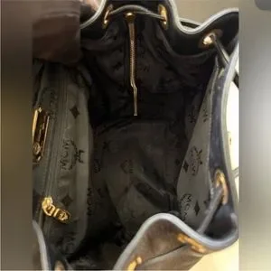 MCM Black Leather Backpack with Gold Accents and draw strings 12"x11"