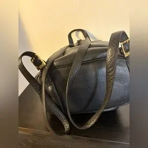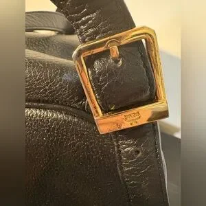 Elegant black leather backpack. Features gold accents and drawstring closure. Spacious interior for essentials.