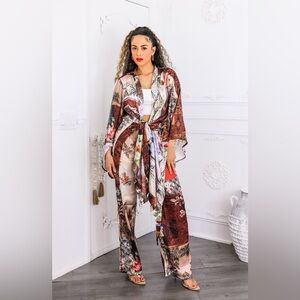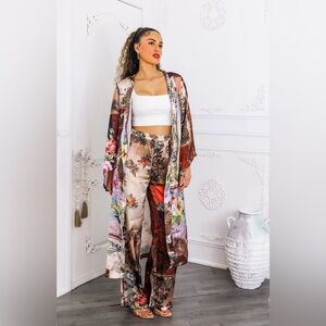 Elegant floral kimono and pants set. Features a mix of vibrant colors.