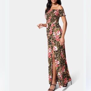 Bebe nwt Off Shoulder Slit Maxi Dress Leopard Floral Print, Size XS | 152