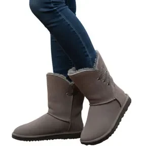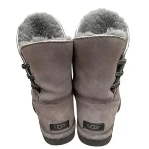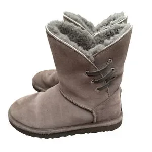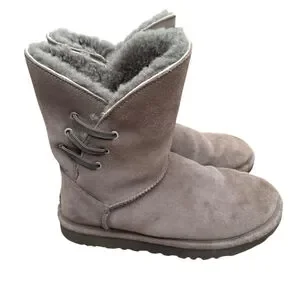 SEO Keywords: UGG side lace boots women 8, gray suede UGG boots, sheepskin lined winter boots, mid calf UGG boots, cozy fall winter boots, UGG lace detail boots, warm snow boots women