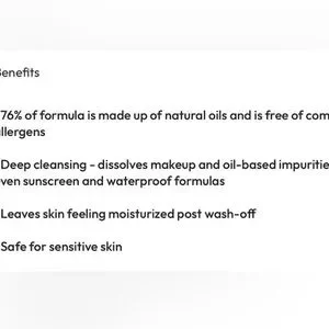 Deep cleansing - dissolves makeup and oil-based impurities, even sunscreen and waterproof formulas. Leaves skin feeling moisturized post wash-off.
