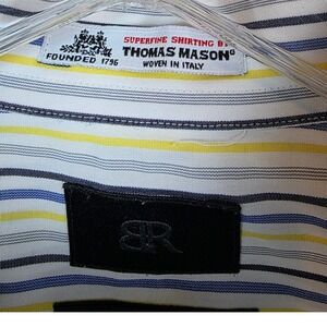 Keywords: Thomas Mason, striped dress shirt, Italian shirting, menswear, button-down, formal shirt, business casual, fine fabric, embroidered logo, classic fit, quality garment, gifting idea