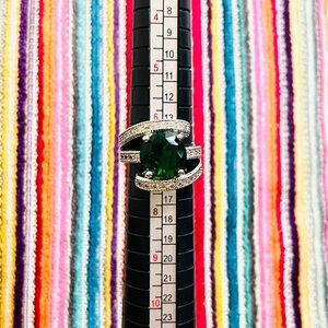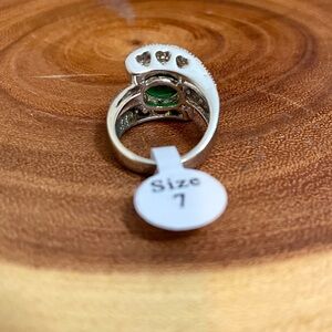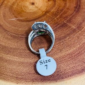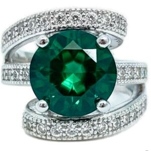 This ring is a silver engagement band featuring a large round-cut simulated emerald green cubic zirconia center stone in a 4-prong setting surrounded by pave CZs in an abstract shape.