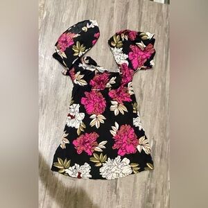 Flirty and fun day dress - perfect for the beach or a coverup! black dress with bold pink and white flowers. Ideal for stylish outings.