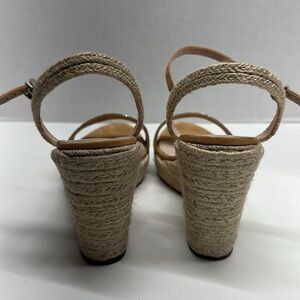 This wedge sandal features woven trim and a delicate ankle strap.