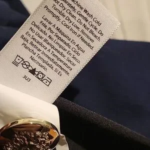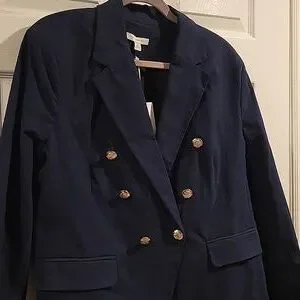 Elevate your style with this elegant navy double-breasted blazer. Perfect for any occasion, this jacket features gold buttons for a touch of sophistication. 2 front pockets. comes with an extra button. shoulders have light padding. inside is lined.