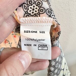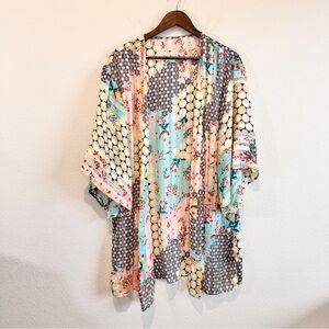 Lightweight boho patchwork kimono with mixed floral and geometric prints in soft pastel tones. Sheer, flowy design makes it perfect for layering, festival outfits, and beachy resort styling. Easy one-size silhouette with wide sleeves and open front.