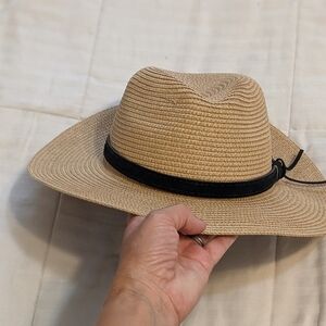 Sun hat with what looks like a black adjustable belt around it but it is not adjustable. super classic for summer. in great condition