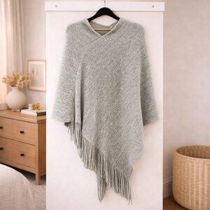 Gray Textured Knit Poncho with soft diagonal striping and an easy, draped silhouette. Asymmetrical hem with fringe trim adds movement while the neutral palette makes it effortless to layer over everyday pieces.