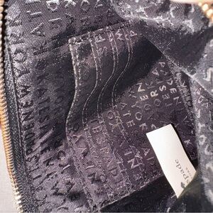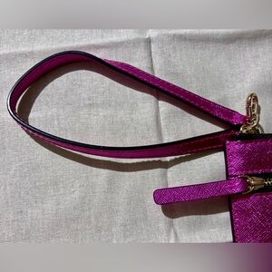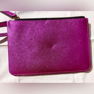 Elegant wristlet with a shimmering finish. Features a sleek zipper and logo detail.