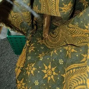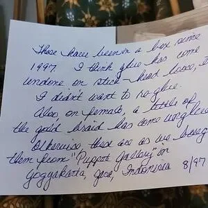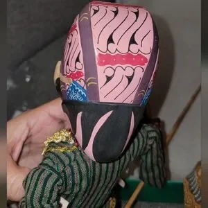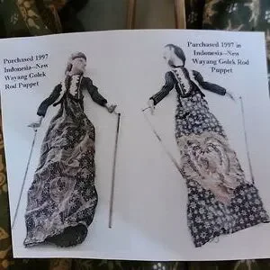 Pair of traditional puppets with detailed designs. Features green, gold, and brown colors.