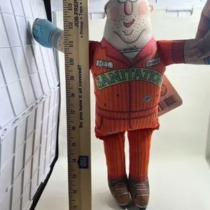 Fun and vibrant plush toy featuring a sanitation worker design. Bright colors and playful details.