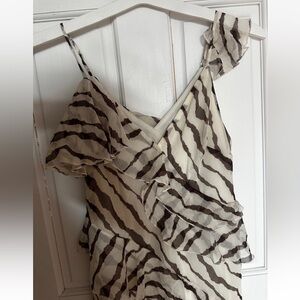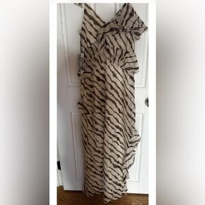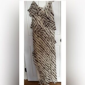 Beautiful statement maxi dress in cream and brown zebra print. Features a flattering one-shoulder design with adjustable strap detail and layered ruffle accents throughout. Lightweight semi-sheer fabric with full lining for comfortable wear.