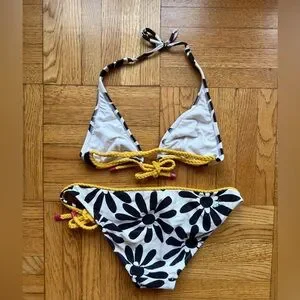 Salinas Black & White Graphic Flower Bikini with Contrasting Yellow Braided Ties