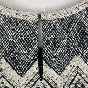 Elegant black sleeveless dress featuring intricate white geometric patterns. Perfect for any occasion.
