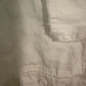 Casual white linen jacket with distressed hem. This is a perfect classic piece to wear in summer. Perfect for the beach, vacation, a resort, a curse, or a day out.