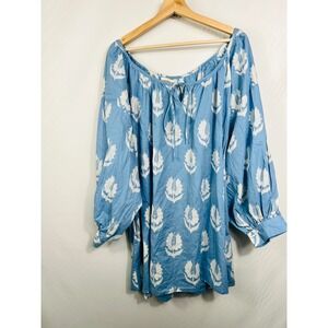 Lightweight cotton mini dress or tunic features a serene blue and white block print pattern throughout. Designed with a versatile neckline that can be worn on or off the shoulder, it includes a delicate tie detail at the center. The voluminous balloon sleeves with button cuffs add a romantic, bohemian touch to the relaxed, flowy silhouette.