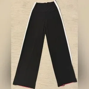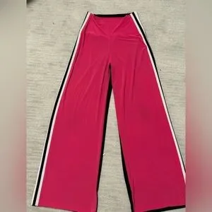 Vibrant pink stretchy pants with stylish side stripes and back is all black. Comfortable and trendy.