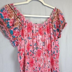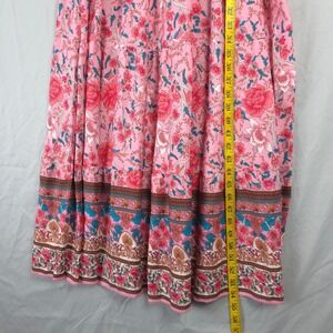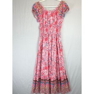 OSTOO Pink Floral Maxi Dress Smocked Bodice Puff Sleeve Boho Women L Feminine