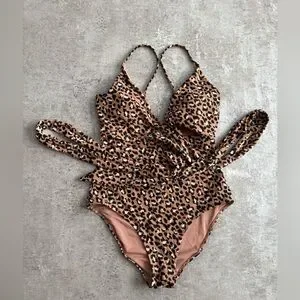 AERIE LEOPARD WRAP ONE PIECE SWIMSUIT FULL COVERAGE WOMENS SZ M PADDED WIRELESS